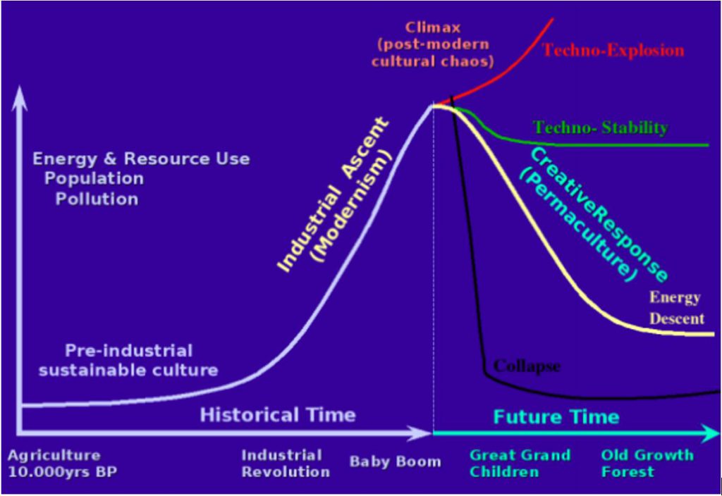 Ante esta situación, traemos a colación la ilustración que hace David Holmgren, cocreador de la Permacultura, en su página Future Scenarios, donde nos plantea cuatro posibles escenarios futuros que engloban el imaginario cultural y la posibilidad ecológica para el siguiente siglo o más.